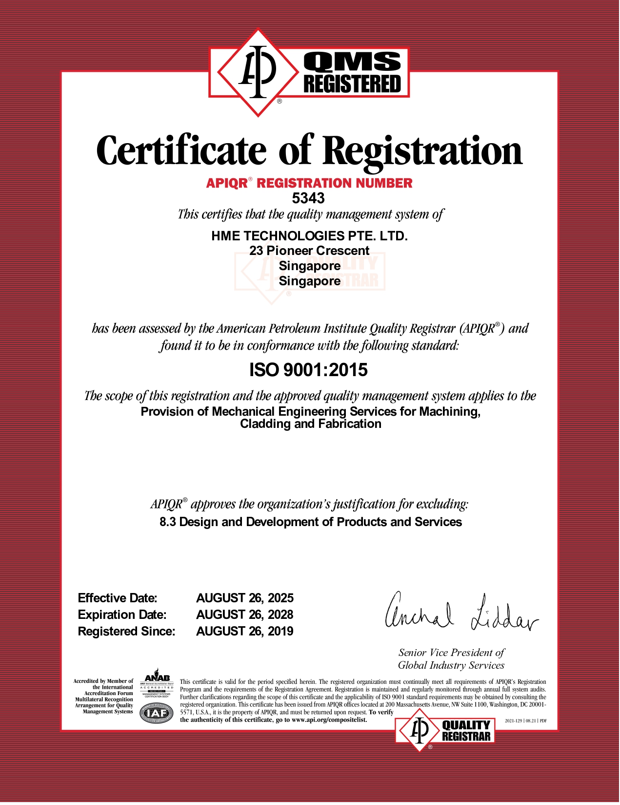 We are ISO 9001:2015 and API Q1 9ᵗʰ edition certified. Ensuring that all our integrated manufacturing and fabrication solutions meet the highest quality standards.